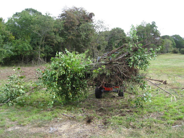 Oh one more thing about clearing up the land that I learned about this weekend. If most of your branches and tree tops are dry/old and you drive over a lot of them you will be surprised from time to time. The best way to explain it is EXPLOSIVE! Wear eye protection at all times but if you just can't stand them make sure you do when you are driving over the debris field. I had several pieces of wood about forearm size give or so snap and throw slivers of wood with quite a bit of force. The crack is quite like a .22 going off just under your tires and it will catch your attention while you see wood flying around and past you.