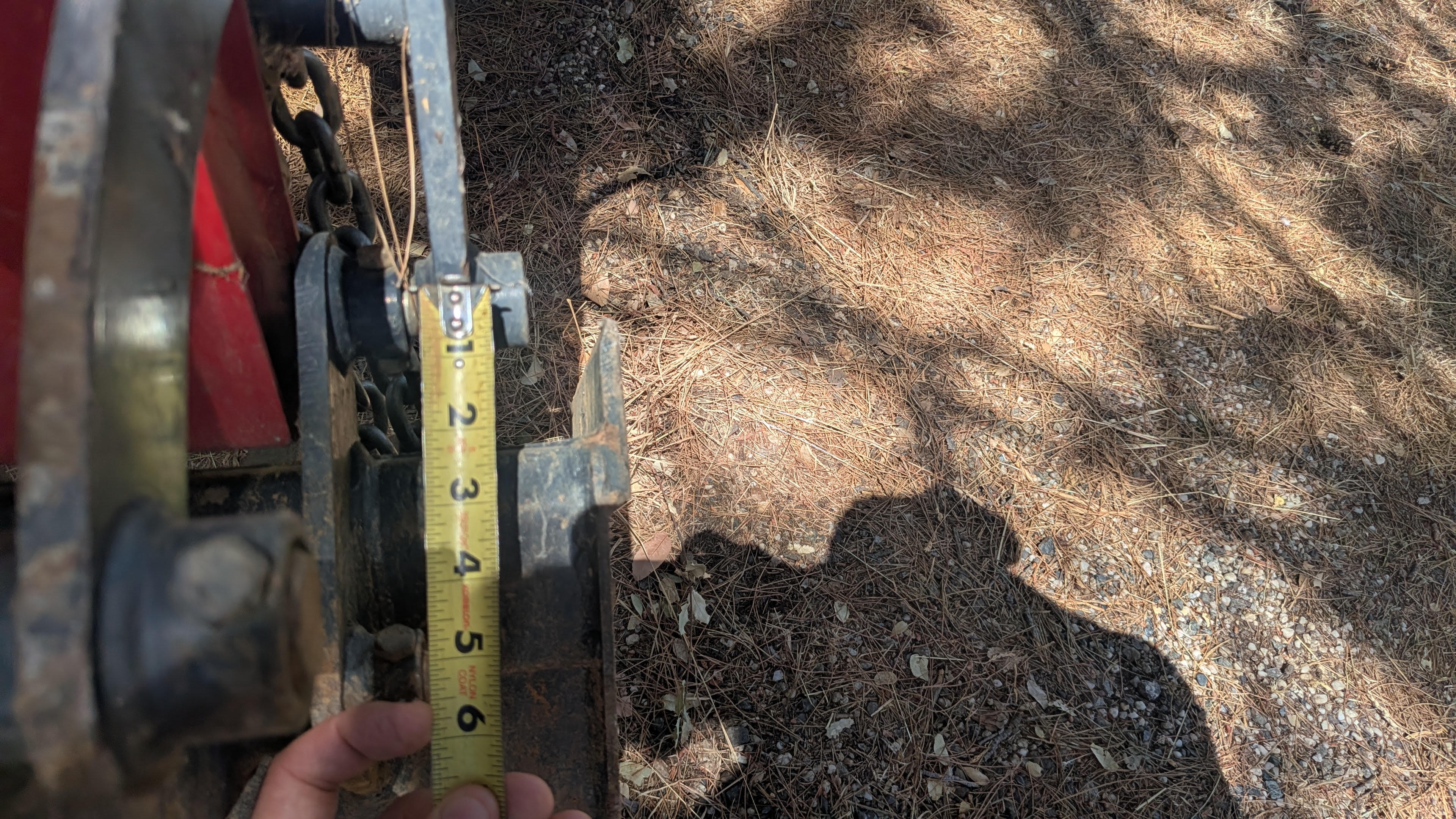 The welds on the bucket on the inside of the ears interfered with the the bucket swinging into place for the quick attach and didn't allow the second pin to be slid into place. I cleaned them up a bit with a grinder (you can see where there's new black paint) - they weren't ugly per se but there definitely was more metal than necessary; I smoothed it out, leaving plenty behind for strength but got enough off so that the pin fits comfortably.