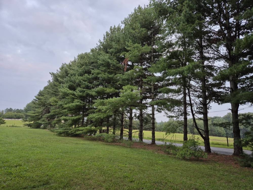 From our house to secondary road is about 500ft. There's a ditch along paved road and my land up about 3'-4' above road. 40+ years ago I ordered a few hundred white pine saplings, spaced 10ft apart with dibble bar along road, up drive, etc. for privacy. They were perfect at about 6ft-10ft but now you see about 1-2ft diameter, highway department limbed them, some died, others cut back for our HV power line overhead to transformer.