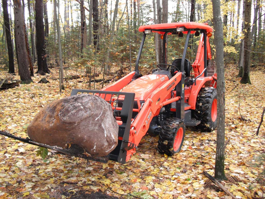 Then there's the issue of getting that big stump or boulder dug out but can't get it out of the hole :(. Put a bucket of the dirt you dug out BACK INTO THE HOLE. Now rock the boulder/stump back and forth with the FEL or BH. Add another scoop of dirt and rock again. Bit by bit the large object will raise out of the hole as the loose dirt fills in below it when you rock it. Soon (or eventually) you will get it up high enough to roll or skid away. :D:D