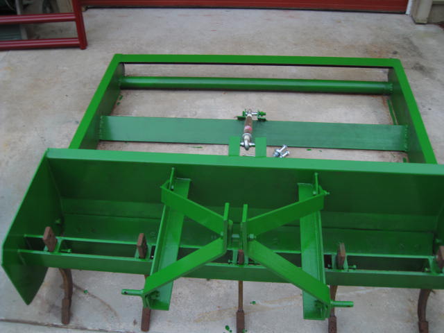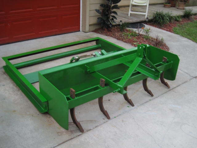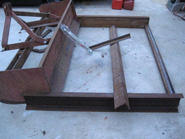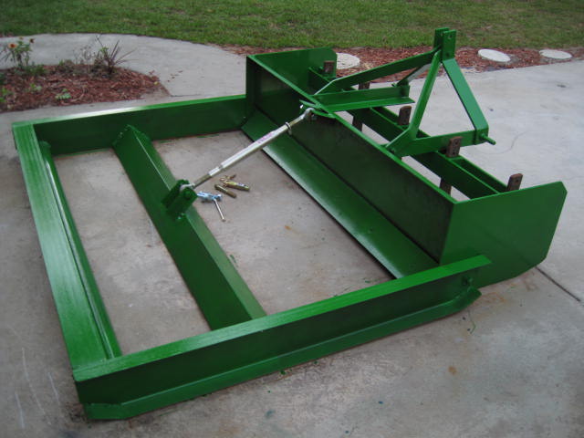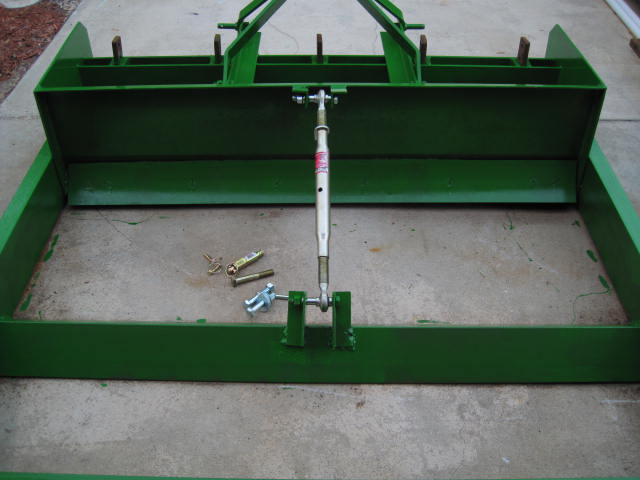 New to TBN and have been reading with appreciation for the great knowledge shared here. I just recently purchased a JD 4400 HST with 430 loader and have been having a ball here in NE Florida. We are clearing overgrown land and want to level some areas. I found a cheap used box blade and figured I'd modify it rather than put out the bucks for a new landplane since used ones are rare. The end product can be used as land plane or unbolted to use as the original boxblade. It cost me a couple hundred in metal froma fab shop but could be built cheaper with a little scrounging. The adjustable link allows height adjustments and if raised all the way up, extra weight on the boxblade. The rear blade is 6"x 6"x i/2" angle and the rear tube is " schedule 40 pipe.