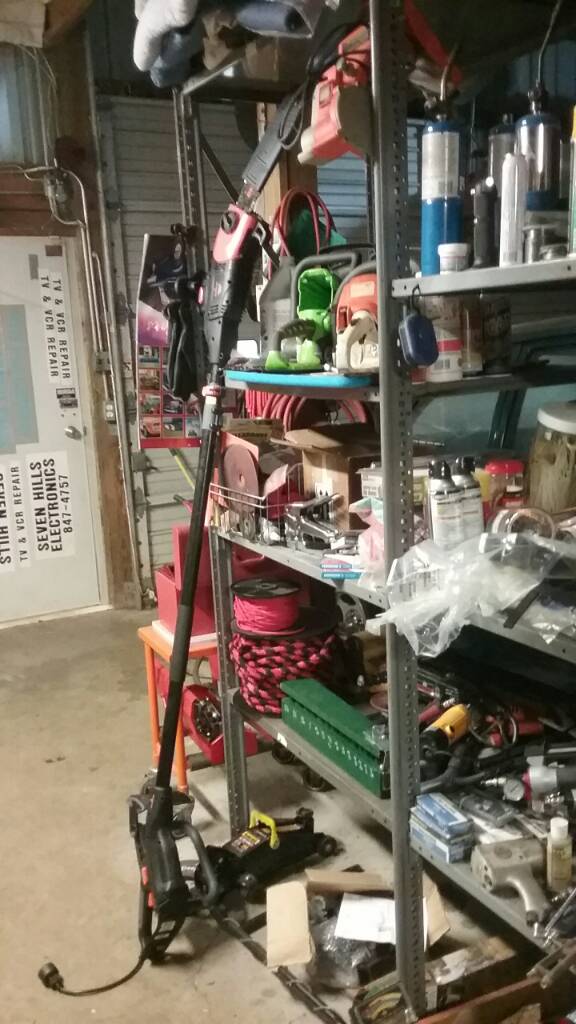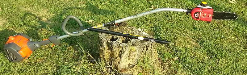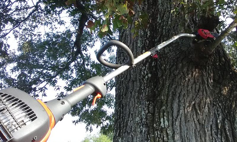 Yesterday I cut some oak tree limbs I'm guessing 20 ft. up or more. I used tractor FEL bucket to get me at least 10' up, then a.c. electric pole saw. This is a Harbor Freight $69 special...works but they don't last, I might get 20-30 hours use before they quit.