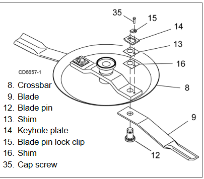 Kodiak uses a 1 1/4 bolt to hold each blade on. The nut's on the top and there is an access hole in the deck. I can't find a torque spec in the manual but it's probably lots.
