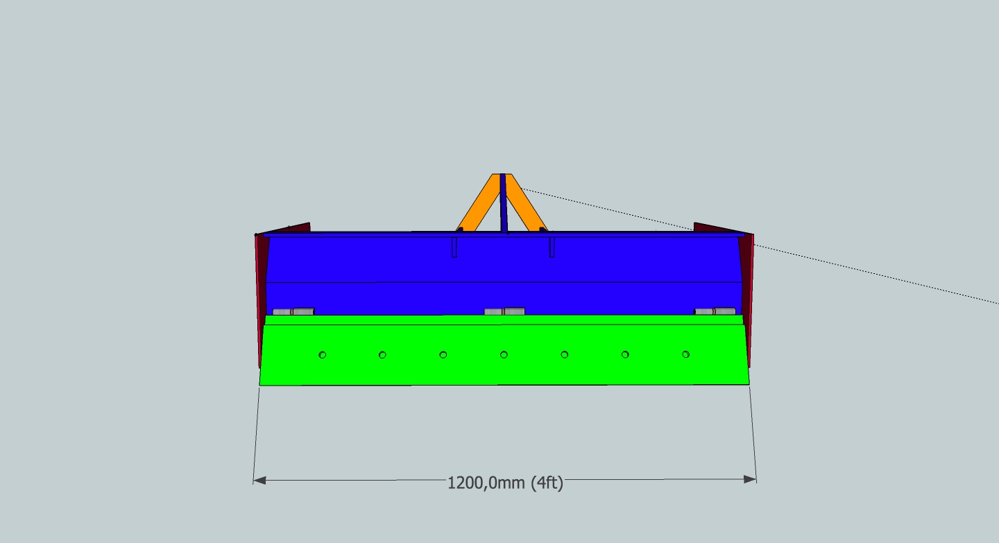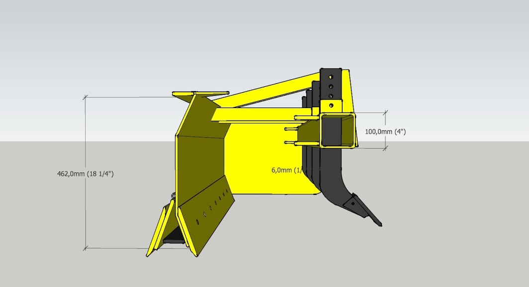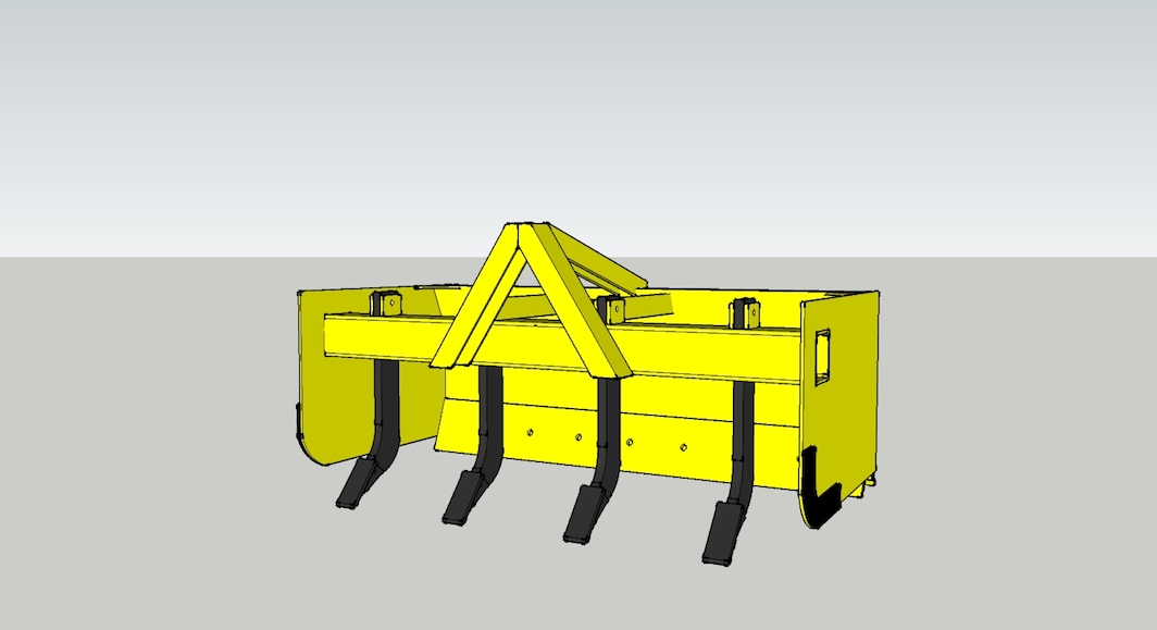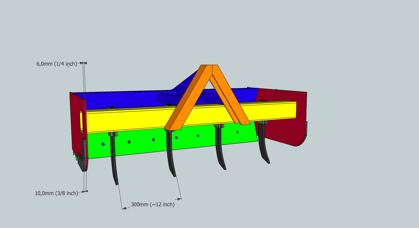 The scarifiers look thin to me. They'll see significant side loads and twisting forces when turning the tractor, and when they are hitting rocks/roots, etc. I'd recommend at least 12mm (1/2") or thicker material. You also may want to weld a "shovel" face on them to make the tips wider, ideally out of hard material.. The scarifiers purpose is to break up and lift the ground, not just to slice it.