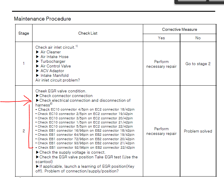 Pleased with myself, and my logic for explaining the problem and the fix, I went to bed. When I got into work this morning, I decided to look up in the shop manual during a break to see if there was any additional information. I looked up the error code and found, S27 F08 with a 1 Hz blinking exclamation point is NOT a wiring harness error. It's an "EGR Position Control Fault".