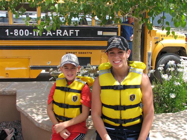Rafting day. Steph was a nervous wreck. She gets to imagining things and then builds on it to drive herself crazy. The kids were all excited about rafting, and she was comfortable with the company that we booked the trip with, so she was doing her best to remain calm. First thing they did was give us a saftey talk and to sign some papers. Then we were fitting with life vests. Helmets were optional, which we declined. Very few people wore them. Then there was another safter talk that dealt with the river, the boats and the guides. This all helped Steph calm down and feel more confident in our guide. We road in an old school bus to the lauch point for Browns Canyon. It was only a five minute bus ride. At the launch point, everyone helped out in unloading the boats and gear. Then we were assigned our seats by the guide. He gave us instructions on how to paddle and what his commands would be. We practiced in the parking lot, then picked up the raft and carried it to the river. Once in the river, we practiced the comands again. Forward, right turn, left turn and backwards. All pretty simple, but according to our guide, dificult for some groups. He was very complimentary of our group, so we were all happy. LOL