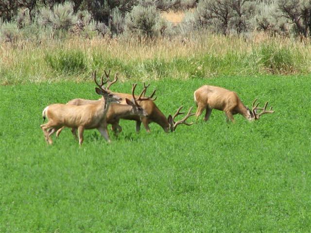 After Gunnison, we crossed the dam and followed the North rim of Black Canyon. We kept working our way around and then back down to Montrose. It was a huge detour, but well worth it. After leaving the canyon, we got into some low lying hills and farms. Out in one of the fields was two groups of mule deer bucks. One group had three bucks, the other had 4. They were about 100 yards from each other, and about that far from the road!!!!!
