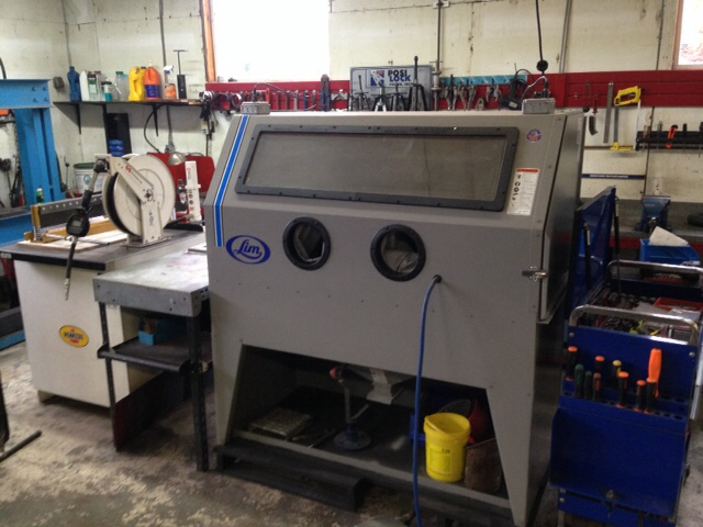 I use a U.S. made Skat Blast cabinet from TP Tools. It will accommodate a 15" wheel. Anything bigger I send it out to be blasted. Terry