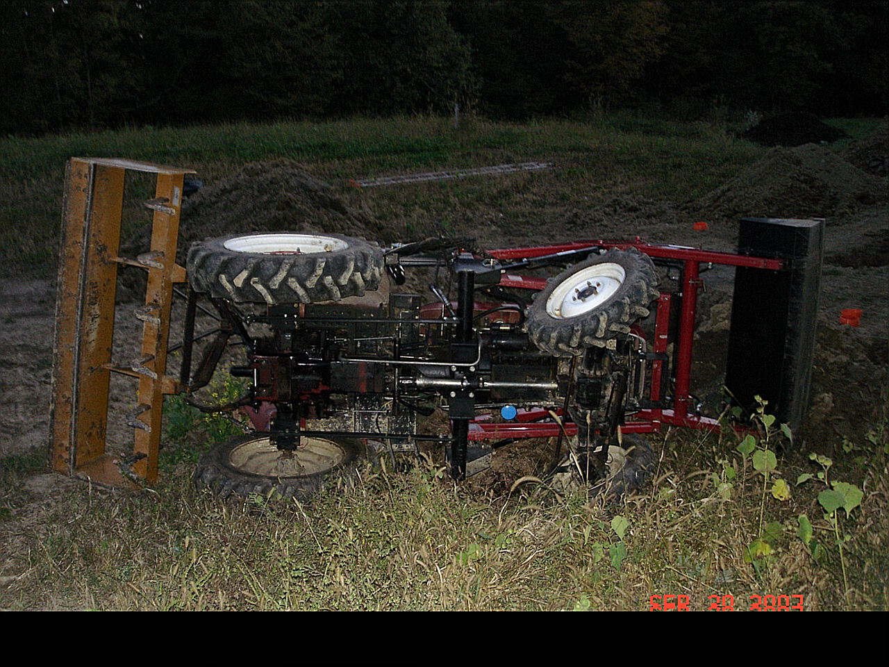 I had a Jinma 284, Spirit loader and a 6' KK box blade for ballast. I was carrying a flat bucket of gravel to backfill a bigfoot deck pier hole, and I had teh bucket as low as possible. As I approached and lifted the bucket to dump, the front tire hit a small soft spot in the clay and over we went in a flash. The box blade and the loader position kept me from going upside down, as I had my hand on the joystick as it flopped, raising the loader to hood height. The BB was just much wider than the tractor.