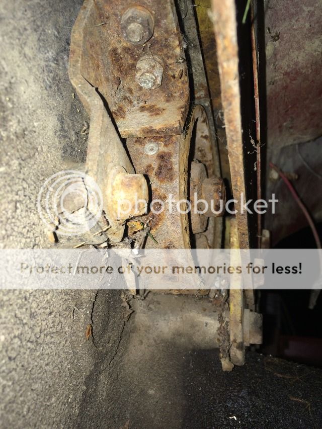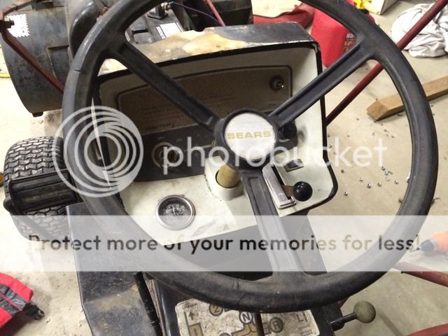 I was just given this tractor when I helped a friend move and he didn't want to take it with him. Its a sears, and he believes its from the 60's. I don't think its the original motor. We are speculating a 25ish horse USA made kohler. There are a few issues I would like to try and fix with the tractor. First, the gears grind all the time. In order to get it into gear I have to idle it down, place the transmission into neutral, force the gear I want, then select high or low. This is apparently the way its always been for my friend. Not a huge deal, except I will be using this almost exclusively to blow snow and would prefer to not have all the extra steps, and wear and tear going from forward to reverse. I believe there might be a few causes for this. If its not the original motor then the pully on the side might be a bit higher preventing the belt from being able to be pushed off the pully. Also when you push the pedal in to release tension on the belt, it also engages the transmission/tractor break. I believe this to be either out of adjustment, or the "brake band" is old and worn down. Also the parking brake hooks up to this system as well and it appears that someone tossed a bunch of washers in there to make a field expedient adjustment, that doesn't do squat. Right now the adjustments for all this are pretty well froze up so I have not been able to play with it to see if I can make it better or worse. If it helps the tractor stops MUCH easier going forward than it does going in reverse. So with the belt not being fully pushed off the drive pully, and the brake not having enough arse to stop the belt I believe the transmission is just continuing to spin which is causing the issue going into gear.