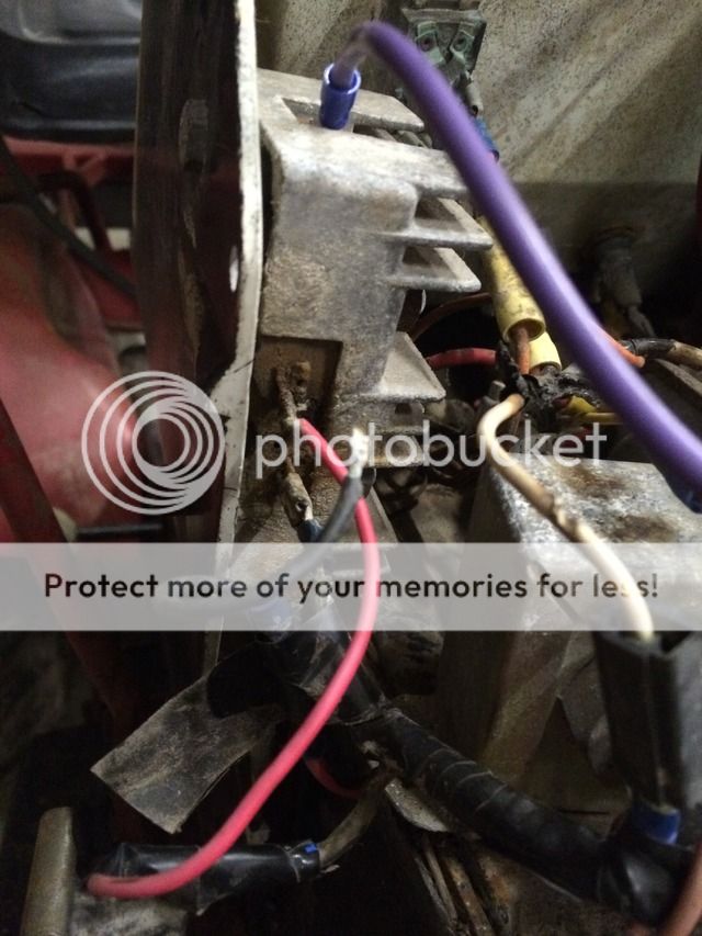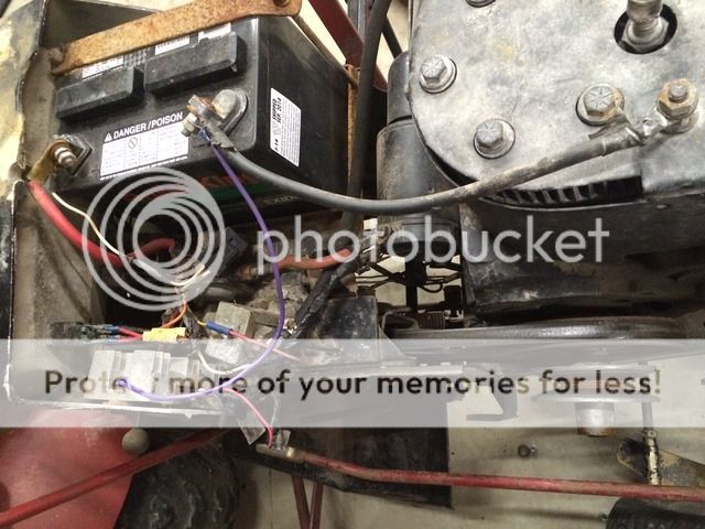 Second, I don't quite understand everything that's going on with this electricly. The lights have long been disconnected. the neutral safety switch has been disabled. there is what I believe to be a voltage regulator with heat sink that has some major corrosion and probably needs to be replaced. Attached to that are a few cords, two hot and a ground, that I believe the two hots are connected to a residential extension cord, then reconnected to some wires coming from inside of the motor. one of the connections as you will see in the photos is a small black jumper, hooked up to a red that has corroded off the connection to the heat sink. The tractor still starts and runs (when jumped (checking the batter today) so I am not sure what that whole thing is actually for. that little wire accidentily touched a ground, and the white wire that goes to a fuse, then to the battery I belive shorted itself out (as you can see from the burn marks) before the short could even blow the fuse.