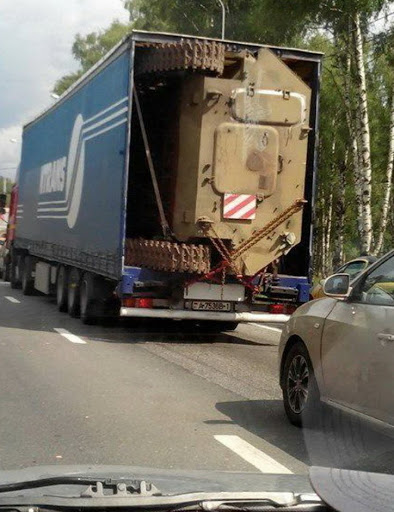 Looking at the hatches on the back you can tell it's an armored personel carrier as opposed to a tank. License plate is definitely European, no clue if its Russian or not. A Russian BMP-2 is a 15 ton machine, the BMP-1 around 13. There were over 20k of the -1 & lots of the -2, so it's a reasonable assumption that's what it is not actually being familiar with what any given APC looks like. They are probably in a similar weight class too regardless of Russian, NATO or whatever origin.