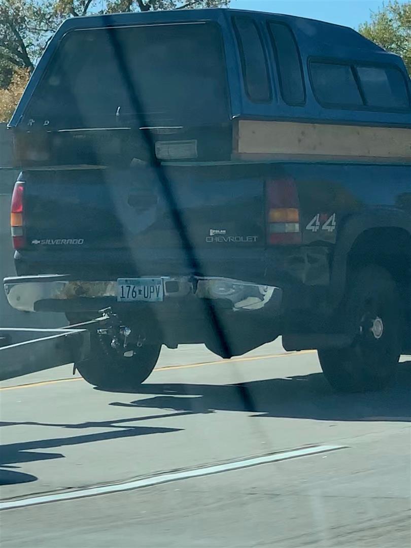 Looks almost like it's setup with a flip down ramps to act like a dovetail and drive something longer than the bed into the bed of the truck.It's a railroader. The top of the blue bars have STOP signs for an engineer. I imagine these are track lock-out signs and the large steel items are derailleurs in case of a workzone incursion