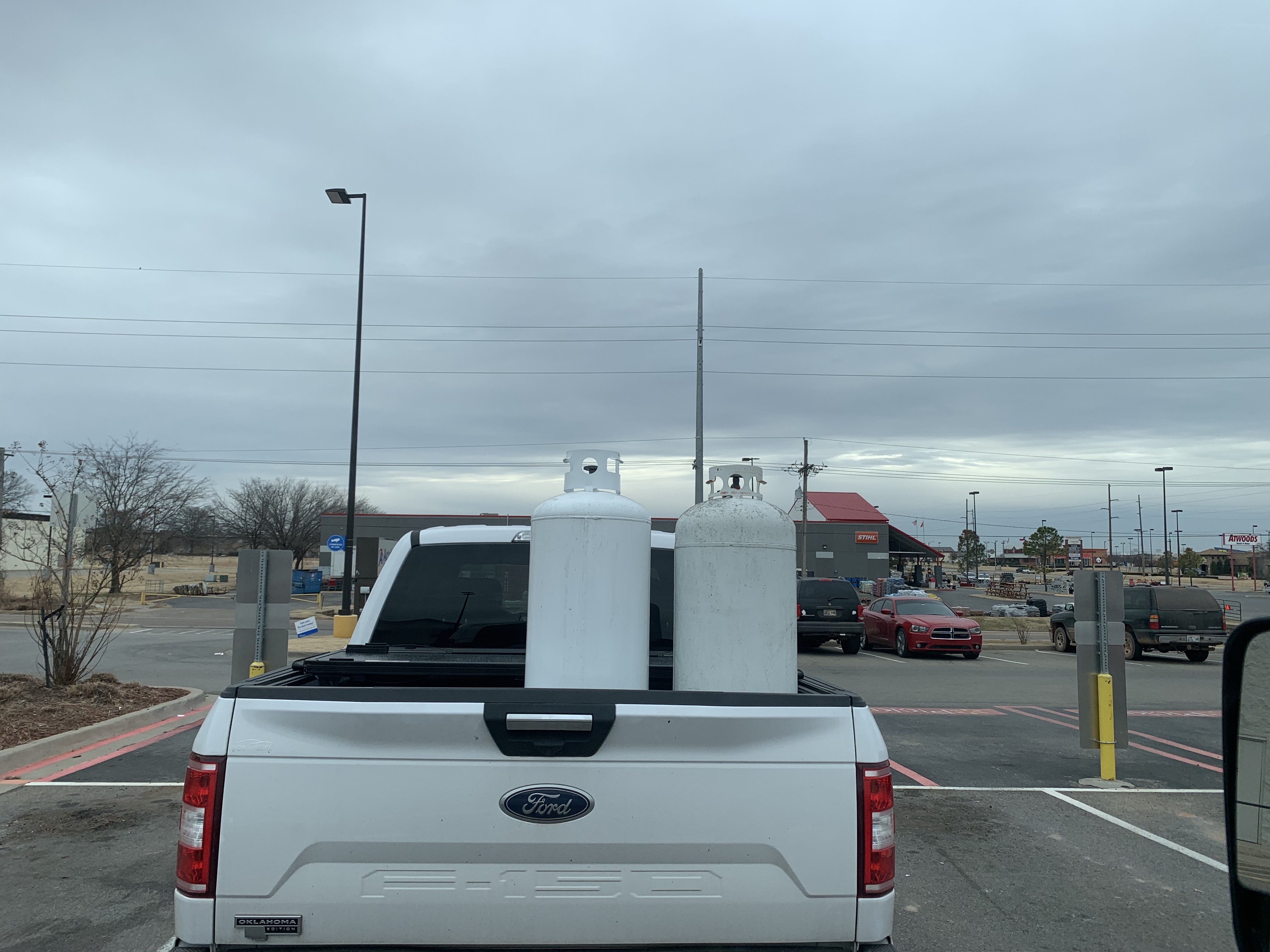 4 straps with protectors (so they dont get cut) start at the top of the left tank with 2 straps, go through the valve guard on the right tank and down to the right side front and rear bed tie downs (or possible the lip of the bed). Take 2 more straps, go from the top of the right tank, through the valve guard of the left tank and down to the front/rear left side tiedowns.How would you strap these? I would put a wood block or two high in between them and strap back to rear tie downs or just a strap around them holding them to the tailgate. Either way there would be no strap visible. Those things fall over way too easily to ever go any distance. I wouldn't drive across my yard with one not strapped.