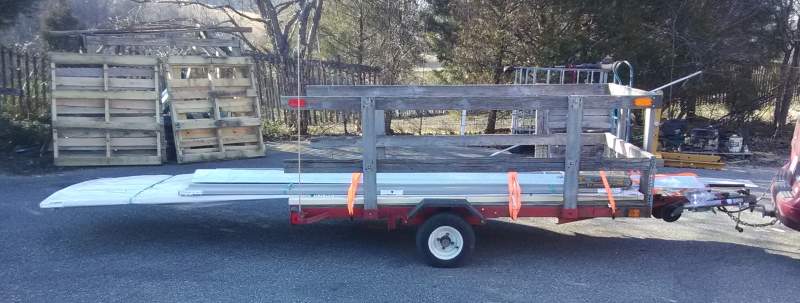 Sometime back I mentioned a load of metal roof panels that I planned on counterbalancing with concrete. I only got six panels this load and only used two fifty pound bags that are under the front tie down. Trailer is 8' and the panels are 13'6" There are also a few 2 x 4 x 8s under the metal.