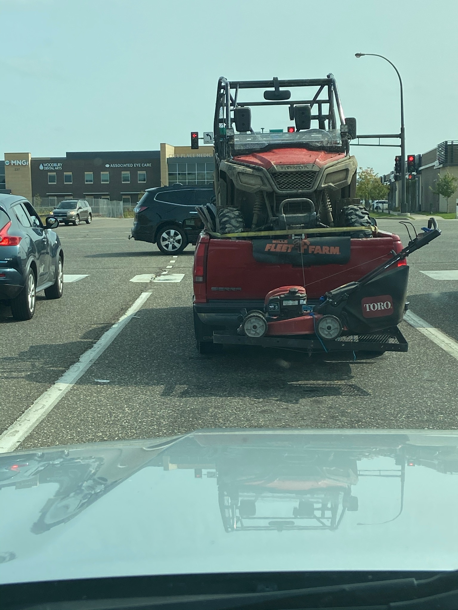 Annnndddd...today's winner. Photo sent by a friend locally here. He didn't get a pic from the side but said it was riding super low. Points for creativity on loading, for sure!
