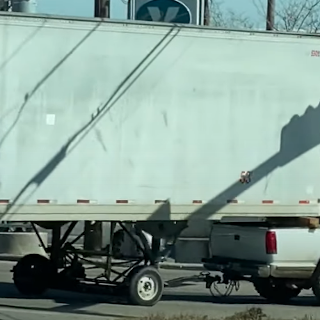 Chevy Pickup Towing 53-Foot Semi Trailer on a Car Dolly Is a Catastrophe Waiting to Happen