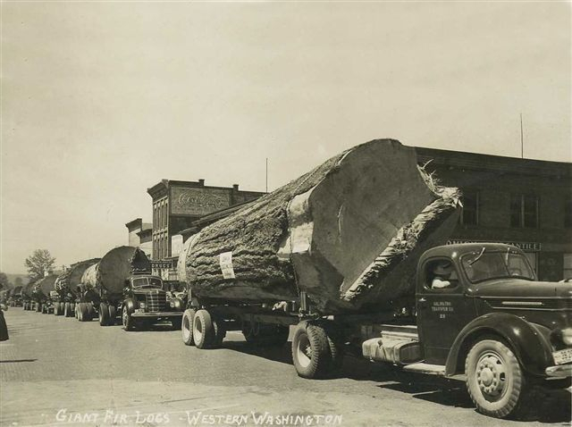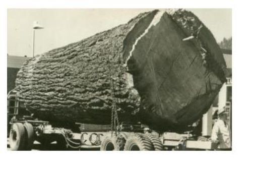 The one picture, maybe both, are from here. I recall trees that big on log trucks back in the day, but not with trucks that old, so those pictures are before my time. Mills these days could not handle trees that size, probably a good thing. Keeps some remaining old growth.