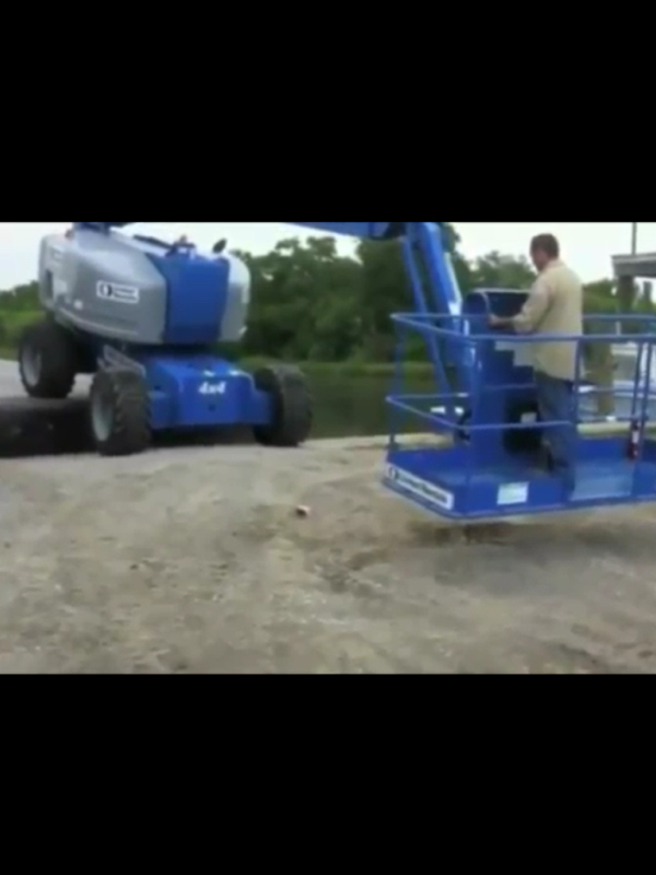took me a min... barge or what ever machine is on. slips out, unit falls in water, and guy goes flying through air into water?