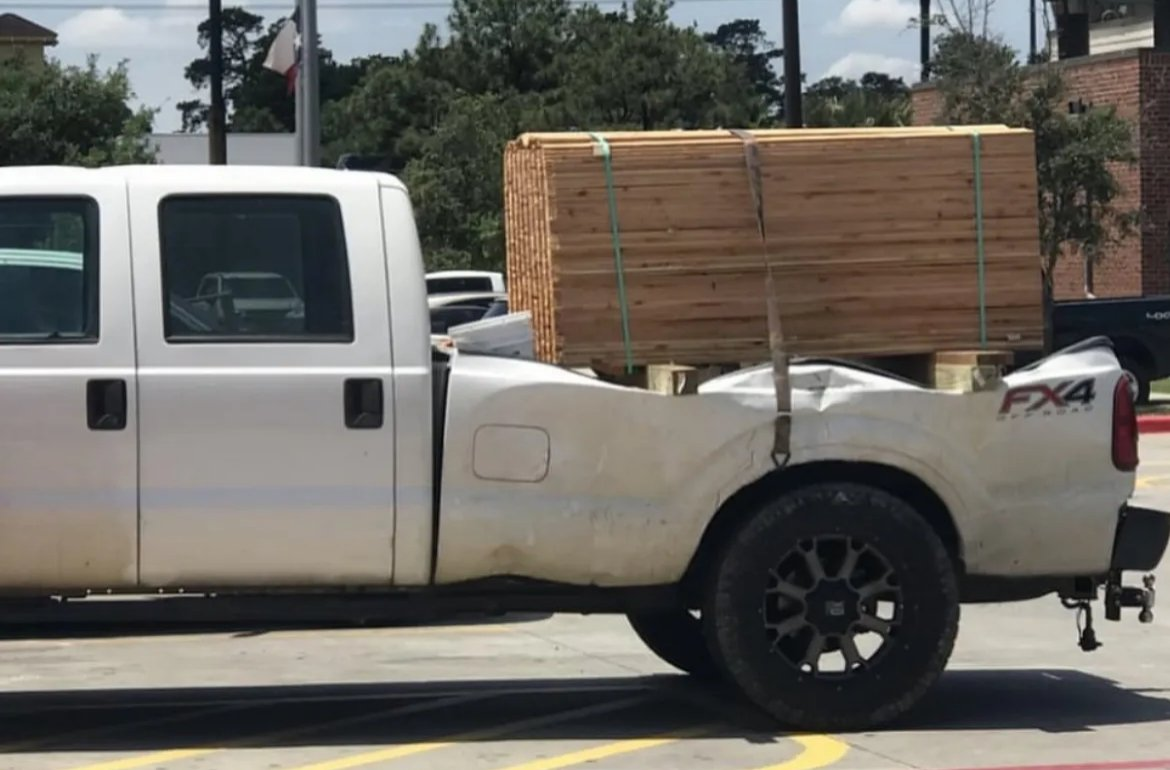 Looks to be a Ford product, so aluminum bed? He was probably ok til he hoss'd on the ratchet strap. Or hit the first bump.It's amazing how stupid some people really are, when you see stuff like this. Yeah, let's reduce the surface over which all that weight is exerted to just four small 3.5 inch squares, and then stand it up on top of some 18 or 20 gauge sheet metal... no problem! Even if just regular KD lumber, the psi at those four contact points where the timbers cross the bed rails is going to be substantial.
