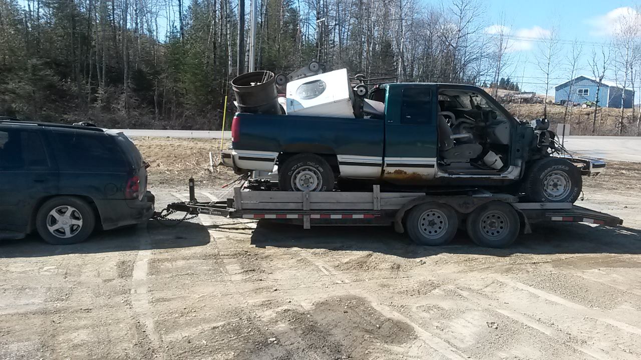 CAPTION: "Traffic Stop in Troop F - Tr. Casavant was on routine patrol and encountered this SUV towing this trailer loaded down with a pickup and junk scrap metal. With the assistance of CVEU Tr. Flynn, it was determined that the vehicle was overloaded by several thousand pounds, the load was not secured properly, the trailer not inspected and there were several safety violations identifed. The operator was summonsed accordingly and vehicle towed."