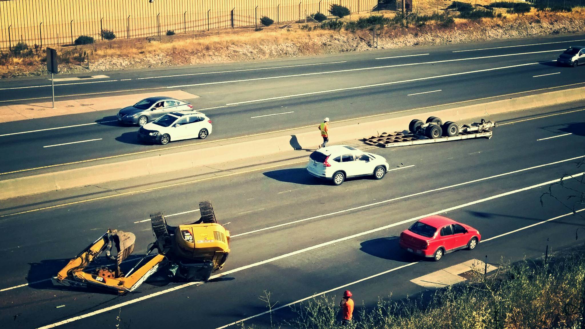 My guess - just a guess - was that the trailer began to fishtail and tossed the excavator off as it overturned. Then the hitch couldn't rotate so it failed.