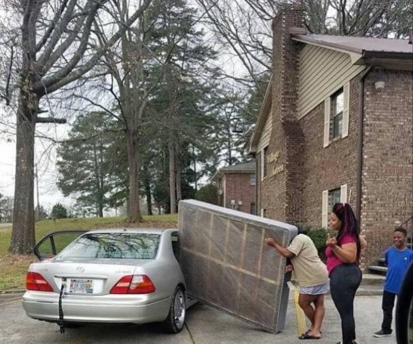 Driving from west to east (heading home) on i-40 bridge from Arkansas to Tennessee, I saw a late model Cadillac 4 door with a mattress on top. Someone in each seat, with an arm out the window holding it down. I told myself "welcome to memphis! Your stupid enough to live here too"