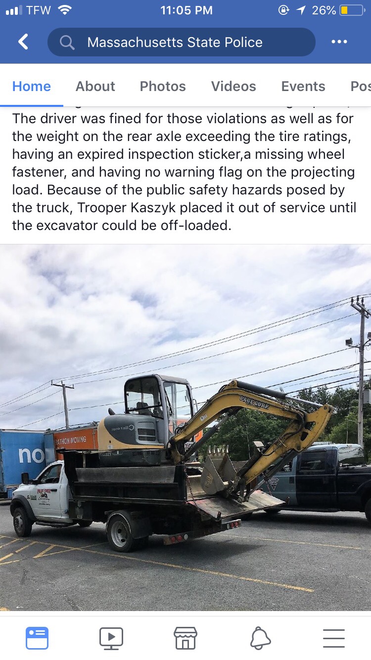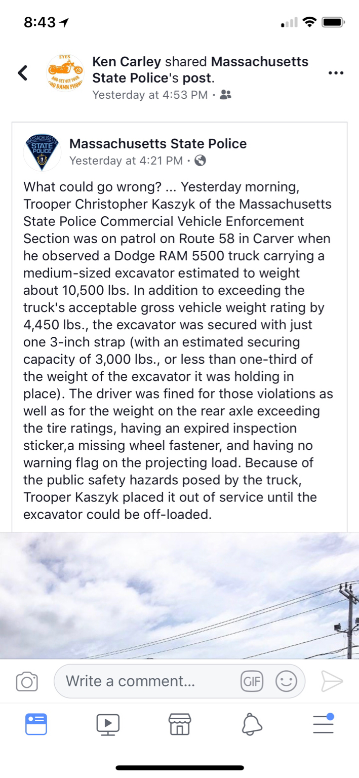 What could go wrong? ... Yesterday morning, Trooper Christopher Kaszyk of the Massachusetts State Police Commercial Vehicle Enforcement Section was on patrol on Route 58 in Carver when he observed a Dodge RAM 5500 truck carrying a medium-sized excavator estimated to weight about 10,500 lbs. In addition to exceeding the truck's acceptable gross vehicle weight rating by 4,450 lbs., the excavator was secured with just one 3-inch strap (with an estimated securing capacity of 3,000 lbs., or less than one-third of the weight of the excavator it was holding in place). The driver was fined for those violations as well as for the weight on the rear axle exceeding the tire ratings, having an expired expiration sticker,a missing wheel fastener, and having no warning flag on the projecting load. Because of the public safety hazards posed by the truck, Trooper Kaszyk placed it out of service until the excavator could be off-loaded.