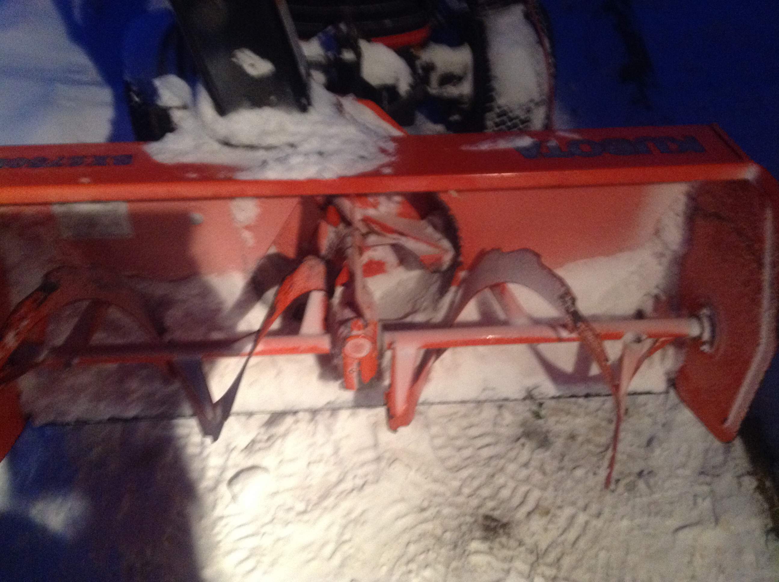 I did manage to snap some shots before we left home in the morning as the tractor is by the front porch and the light comes on. But it was -25C (-41C with wind chill, and -40C = -40F so you know what I'm talking about!) and my hands froze up in the time it took to do it and I had to go in and warm up in between. You can see the hole by the fan. Sticking a pin in that hole does get a catch, but because of the position of the blade there's no room to manoeuvre. Oddly, sticking a pin in the other side where there is slightly no room gets me no catch. I don't get it. I'm wondering: if I did pull the C-clip off, how far does the fan come forward? all the way? any chance of poking around the hold behind the fan? looks pretty tight.... Temperature staying the same all week so I lose nothing by being away...<img src="http://www.tractorbynet.com/forums/files/kubota-owning-operating/412265-shear-bolt-madness-blowerfanhole-jpg"/><img src="http://www.tractorbynet.com/forums/files/kubota-owning-operating/412266-shear-bolt-madness-blowerwhole-jpg"/>
