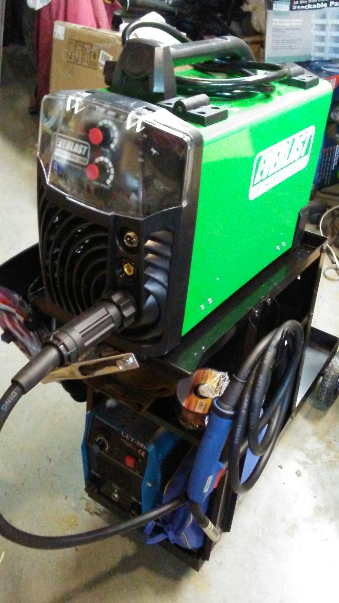 My new toy...er tool came in last week. First job for it was to weld the corners of the cheap HF welding cart. This unit will take some getting used to, my cheapo welder has the wire hot as soon as it's on so you can easily shorten the wire length by hitting the side of nearby metal. The Everlast isn't hot until you pull the trigger, probably a good thing but something to create a habit with. I'm running flux core for now because I have some rolls hanging around. Curious, does anyone somehow strap these to their carts and still open the side door? This cart may get bigger rear tires and a front handle so it can be brought outside without sinking in the sand, I would like the welder to stay put while dragging it around.