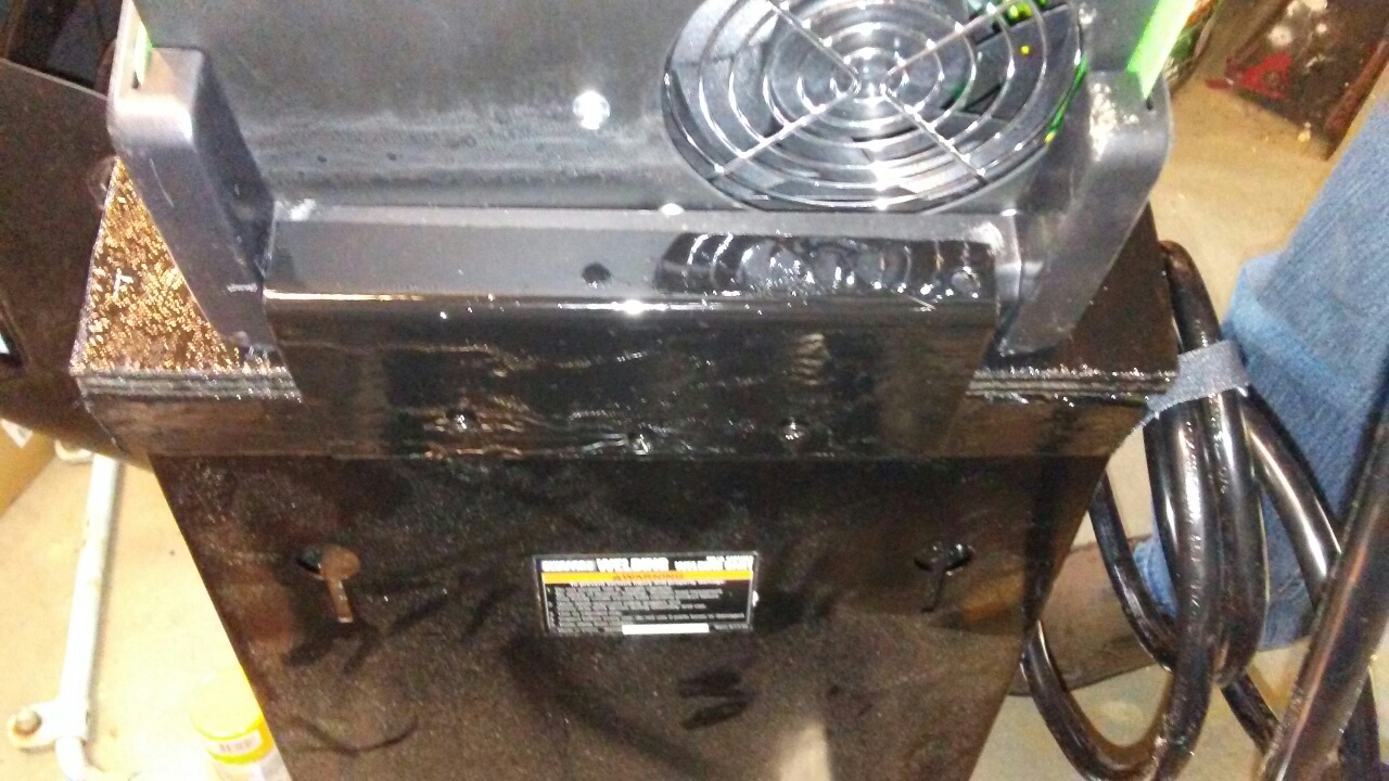 I liked how someone else modified their HF cart because the welder did not fit. They made a platform that was high enough to add a drawer out of wood. I did something similar which allowed me to screw some metal pieces for ease of locking the welder down. There's an angle iron type piece in the back that the rear of the welder fits under then I slide it to the right so the door side fits under another (door still latches fine). Lastly I have a piece on the left side that slides into the face cover, this piece is locked down by a bolt that has a large nut welded to it for easy removal. That is hard to make out because of the shiny black paint. I really like having the drawer to put parts in. I can fit a couple 2 pound spools of wire in the back.