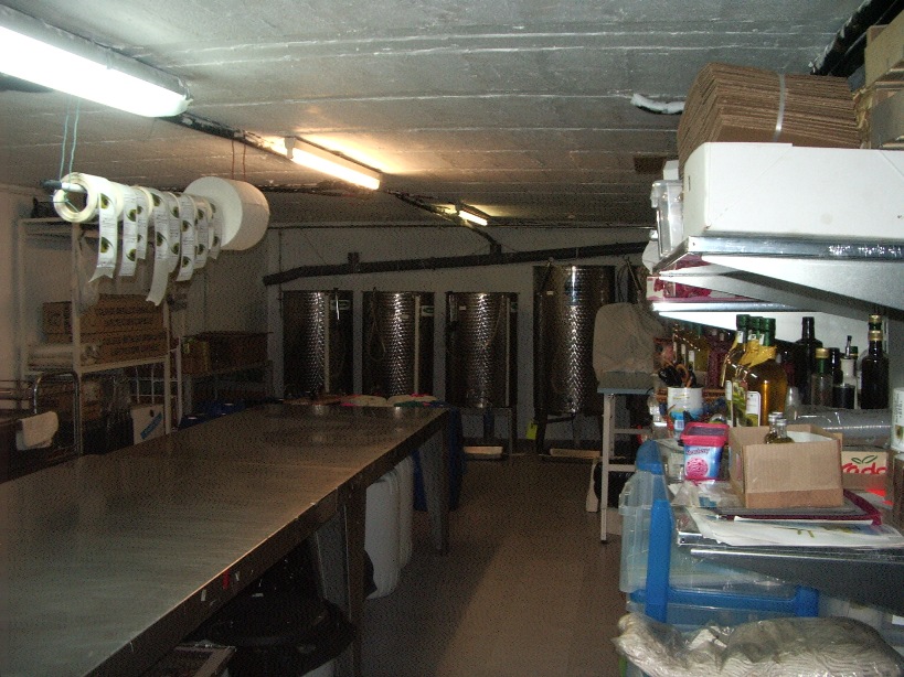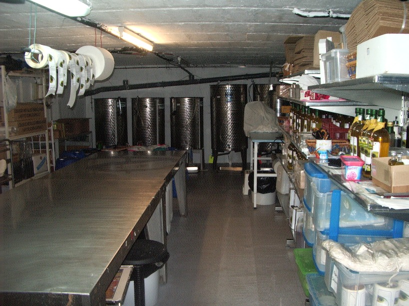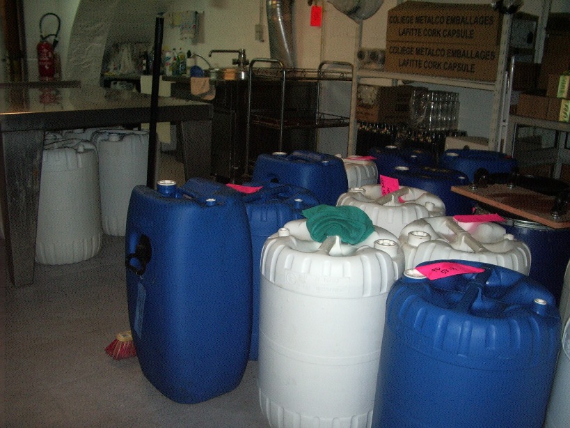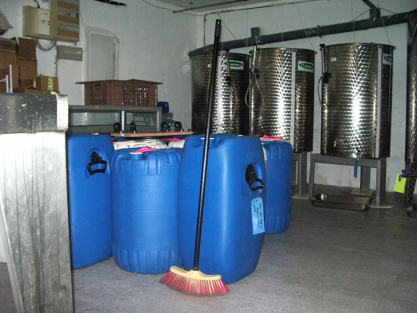 Dave If you look at the flow chart previusly previously posted I included a pic of a typical olive crate, it is yellow. Our mill will process about 240 of these crates per day. It will press 200 kilos per hour. The big question is the yield of the olives. Some olives yield 23% of their weight in oil, some 14% of their weight in oil. Figure on the attached pic we will produce 4 of the tanks plastic you see shown. I laid a broom on a tank to give you perspective. I hope everyone can see and appreciate how clean our olive work room is. It is spotless, we want to work in a clean environment!