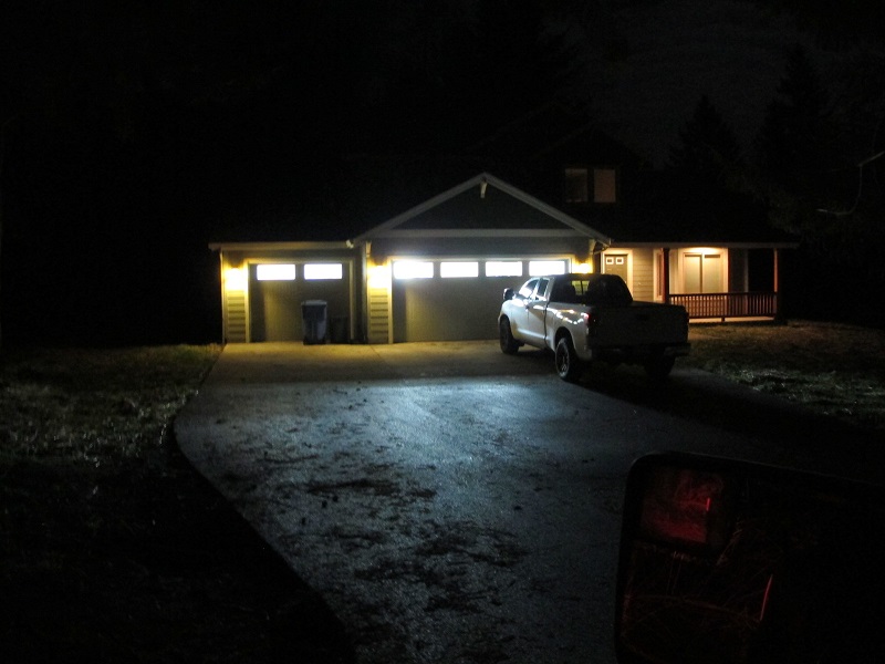 I added 2 more of these shop lights this weekend, if it was any brighter I'd need sun glasses. Look at the front porch flood lights, now look at the garage lights, they blast clear out into the yard. Lithonia Lighting Industrial 6 Light High Bay Hanging Fixture IB 632 MVH at Home Depot with Phillips Daylight Deluxe T8 bulbs.