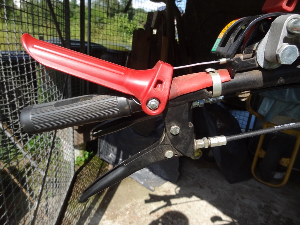 I cut a 7.5 cm (3’’) piece off of a 2 mm (5/64’’) thick garden hose, cut it in half lengthwise, and fastened one of these pieces on top of the handlebar with a hose clamp. This has worked well ever since, as the OPC-lever is now much easier to reach, without compromising its function. The cables from the clutch and OPC-levers are mechanically connected at the clutch, allowing oil pressure to build up and engaging the clutch when they work correctly. One should therefore not overdo it, as that might prevent the OPC-lever from operating as intended!