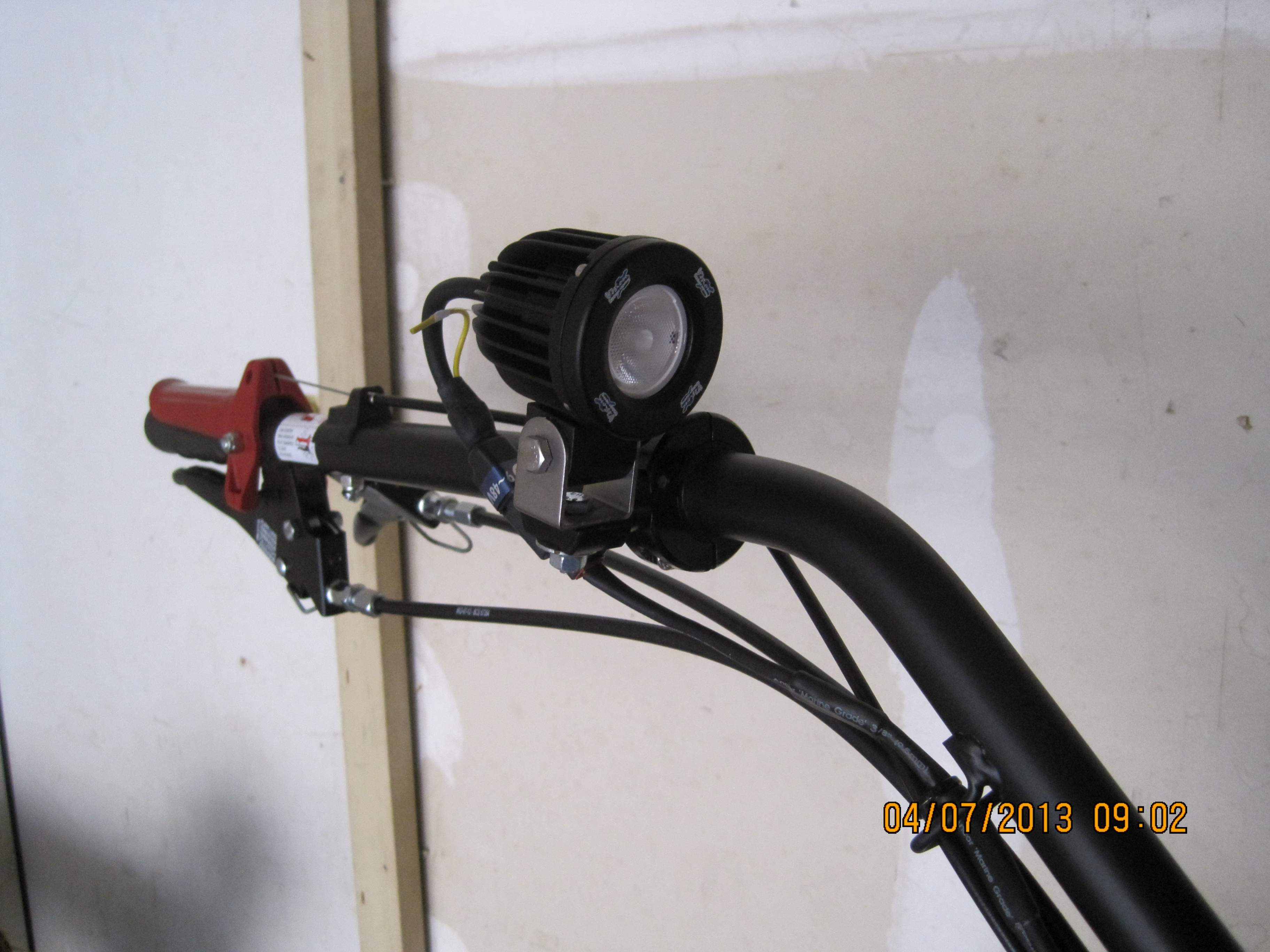 Did the same thing with the light. I just replaced my key switch(worn out) with a handle bar mounted on/off toggle and push button start. (No kids around, no real safety concerns) Where do you get the hour meters and about how much? All my seasonal equipment gets serviced at the start of the season-need to do that now-- but my BCS runs year round so knowing the hrs would be nice.