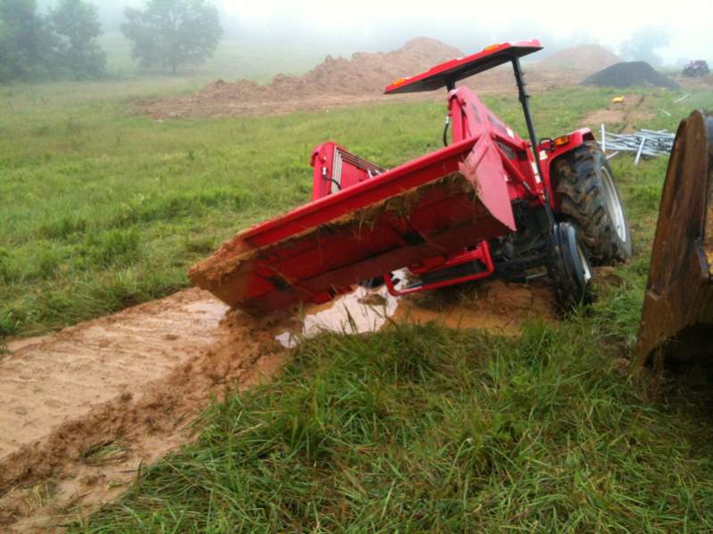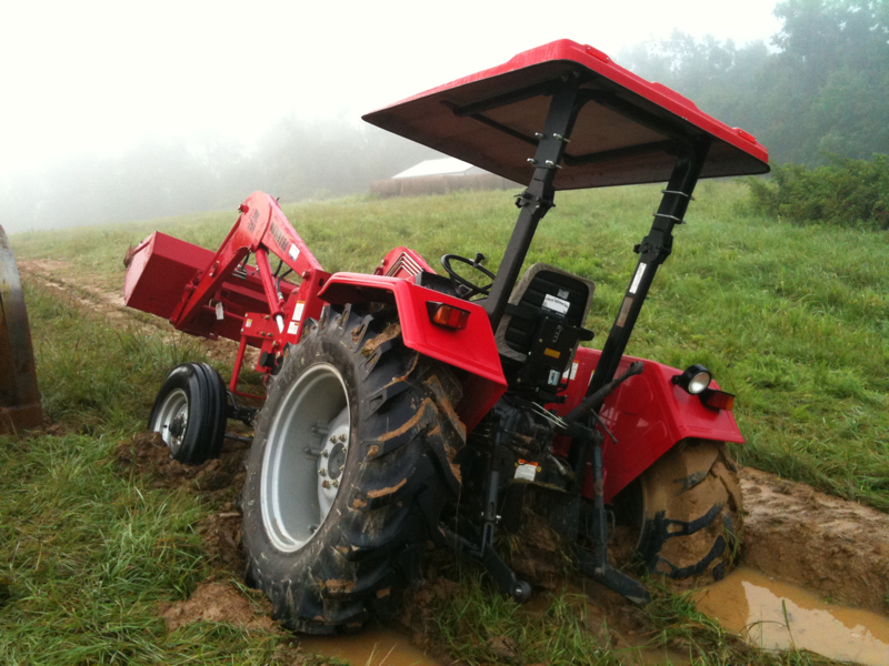 This is as stuck as I ever had the old mahindra 6025, slipped into a trenched hole and had to dig her out with a track hoe. Traded up to a 4wd 8560 shortly thereafter. Wouldn't have another 2wd tractor. Not for the situations I get myself into.:)