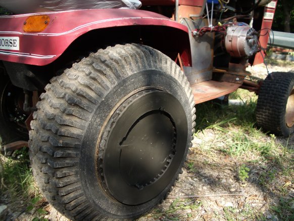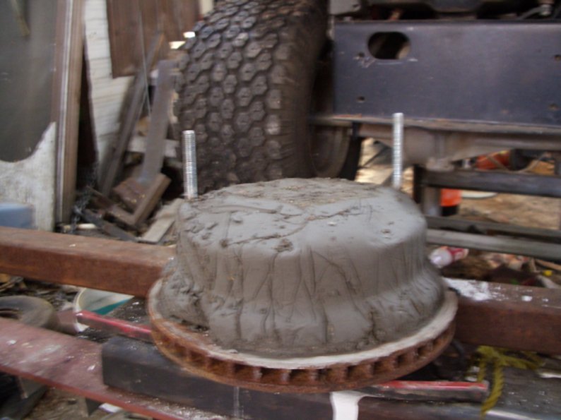 Here's a couple pic's of some wheel weights I made to fit my Wheelhorse and Big 10. I started with front disk from a F250. I first drilled two holes in the disk for attachment bolts, cut a piece of cardboard to fit tight into outside of rim and then lined the rim with a trashbag. I then placed the disk on top of rim with it sitting level on it's side, installed the bolts and poured in a souppie mix of sackcrette. Here's the first shot of the just removed, from rim, weight and the second installed on the Wheelhorse.