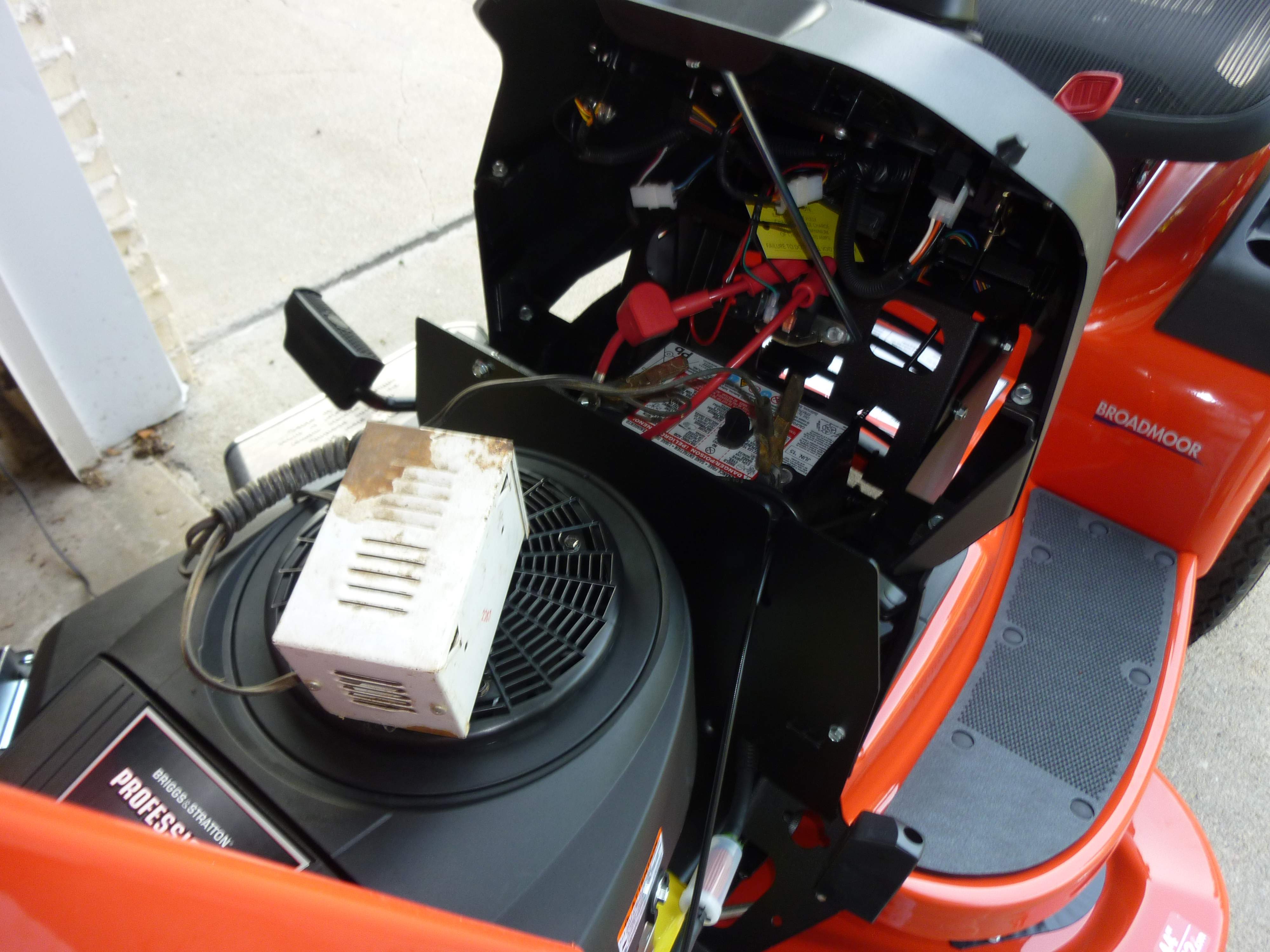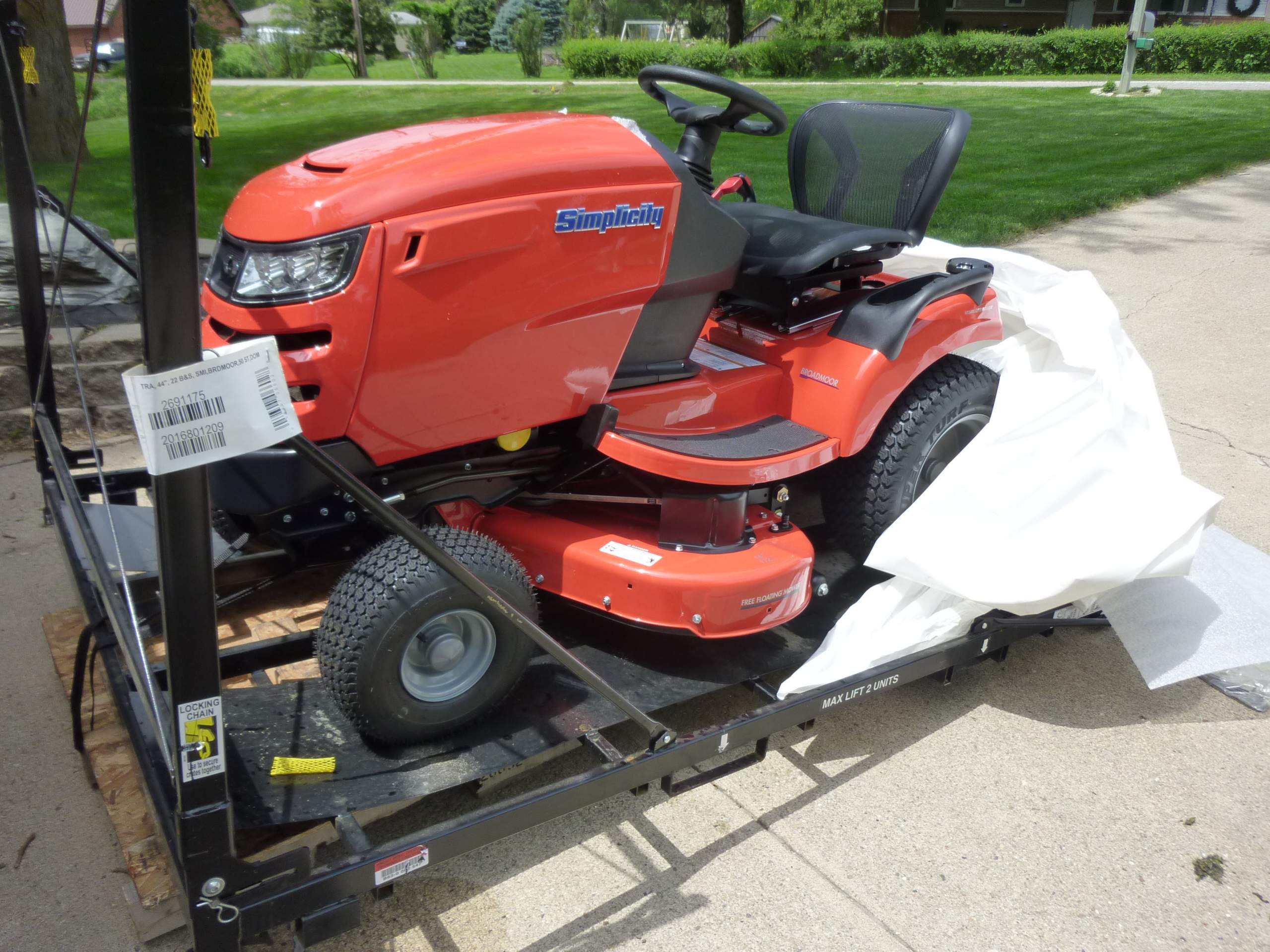 I have about 25 hours on the Simplicity Broadmoor 44-22 lawn tractor purchased last July. So, I guess it's time to write a review. Note: I am neither a tractor expert nor a whiz-bang mechanic. I purchased this machine from Mutton Power Equipment. It arrived on time and in good shape in an aluminum shipping holder attached to a wooden pallet. It was already lubricated, filled with break-in oil, and the deck was leveled. After uncrating the mower, charging the battery, and filling it with gasoline, it started right up.