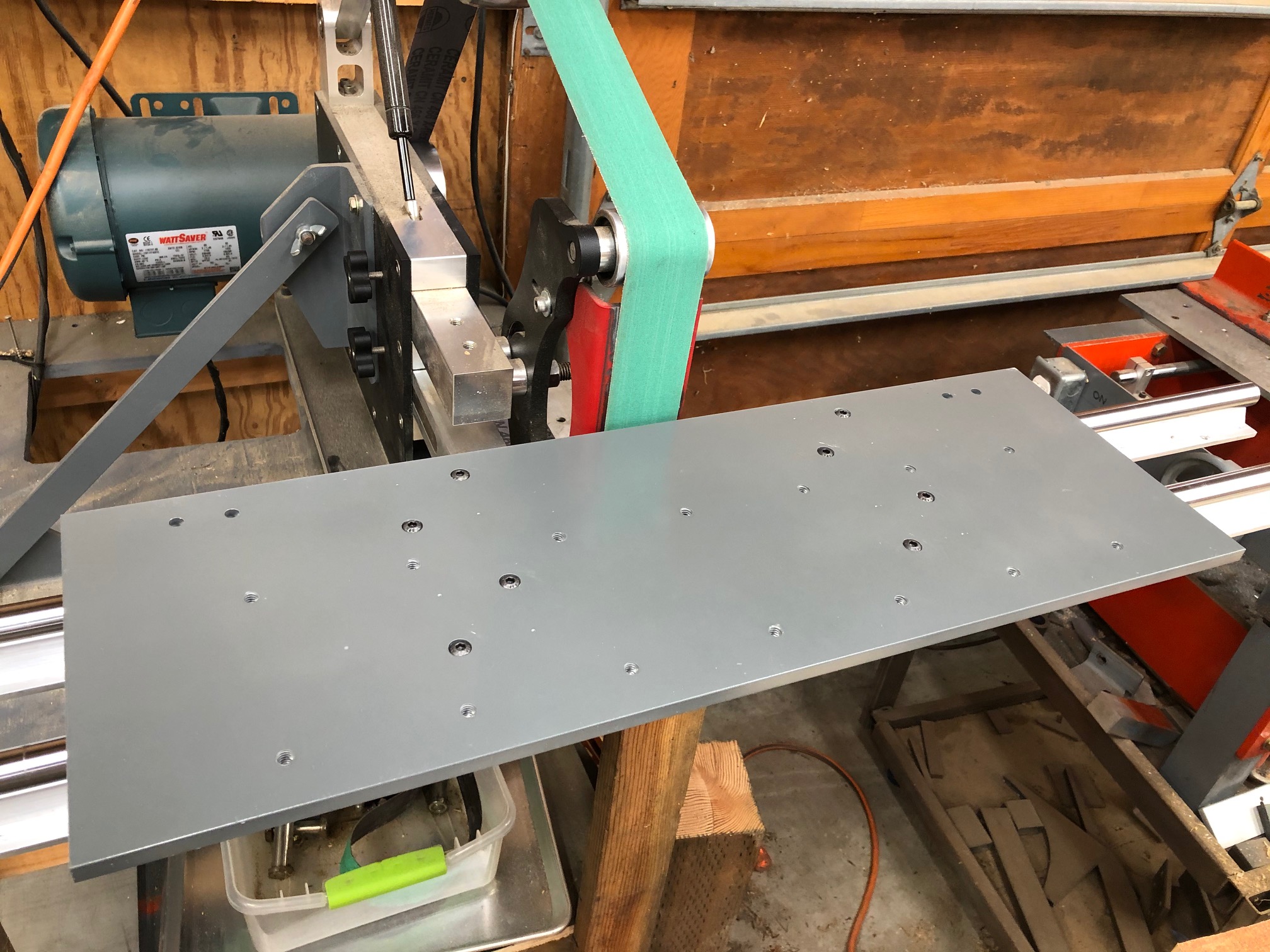 Photo 3 - the work table is 3/8" aluminum. I put a grid of threaded 5/16" holes so standard milling machine hold-downs can be used on large or irregular work pieces. It is also drilled to accept a sliding T-nut extrusion.