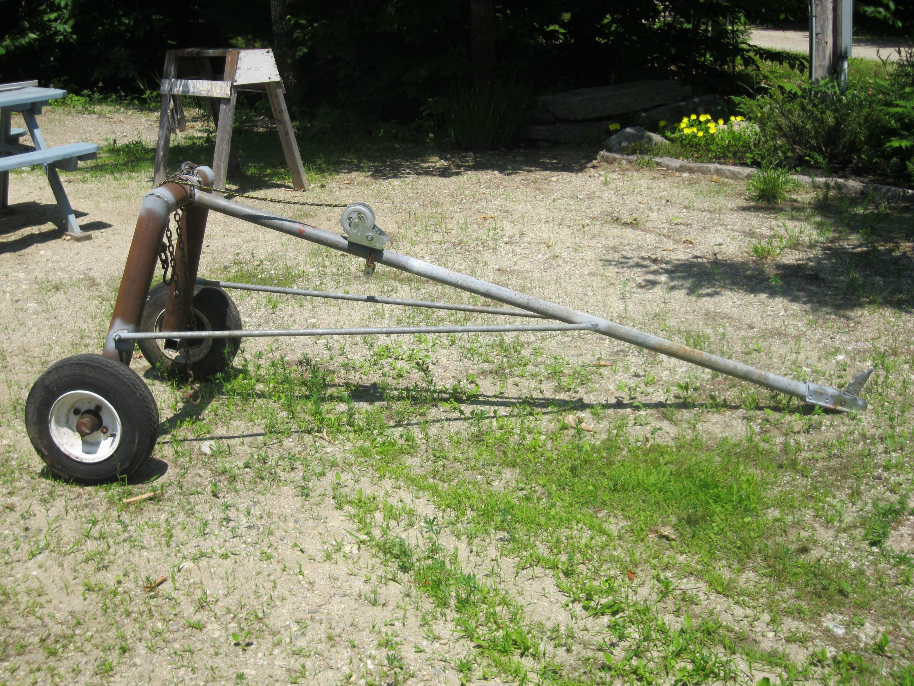 I often have to drag logs out of the woods to feed a sawmill. I built a lightweight dolly, that has been working very well but when I overload it the tires pop. So I built a heavier duty unit, now I have two.