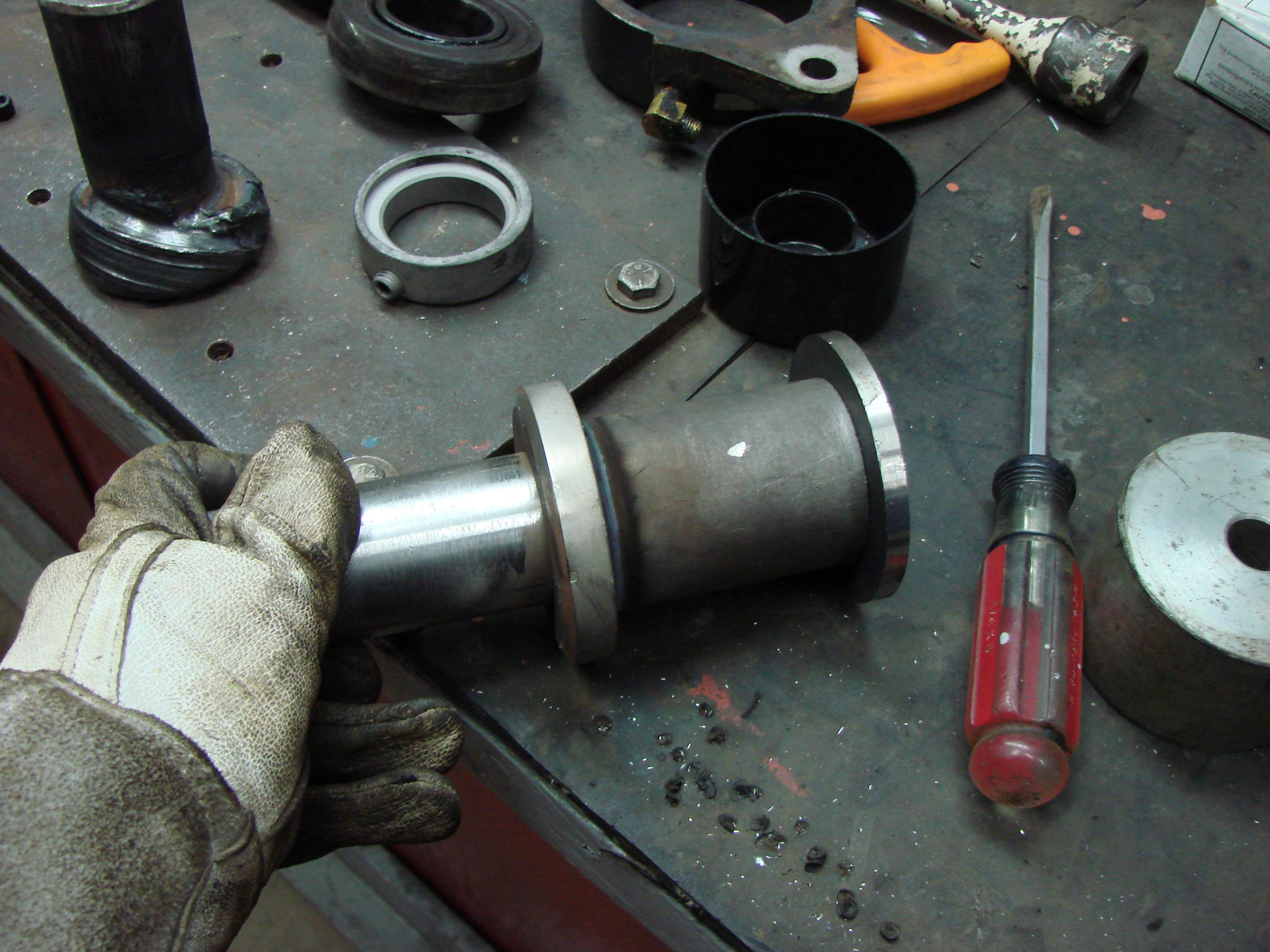 Problem number two was. How am I going to get the new shaft welded straight coming out from that pipe without a lathe? Well I got a brain fart and came up with what you see below.