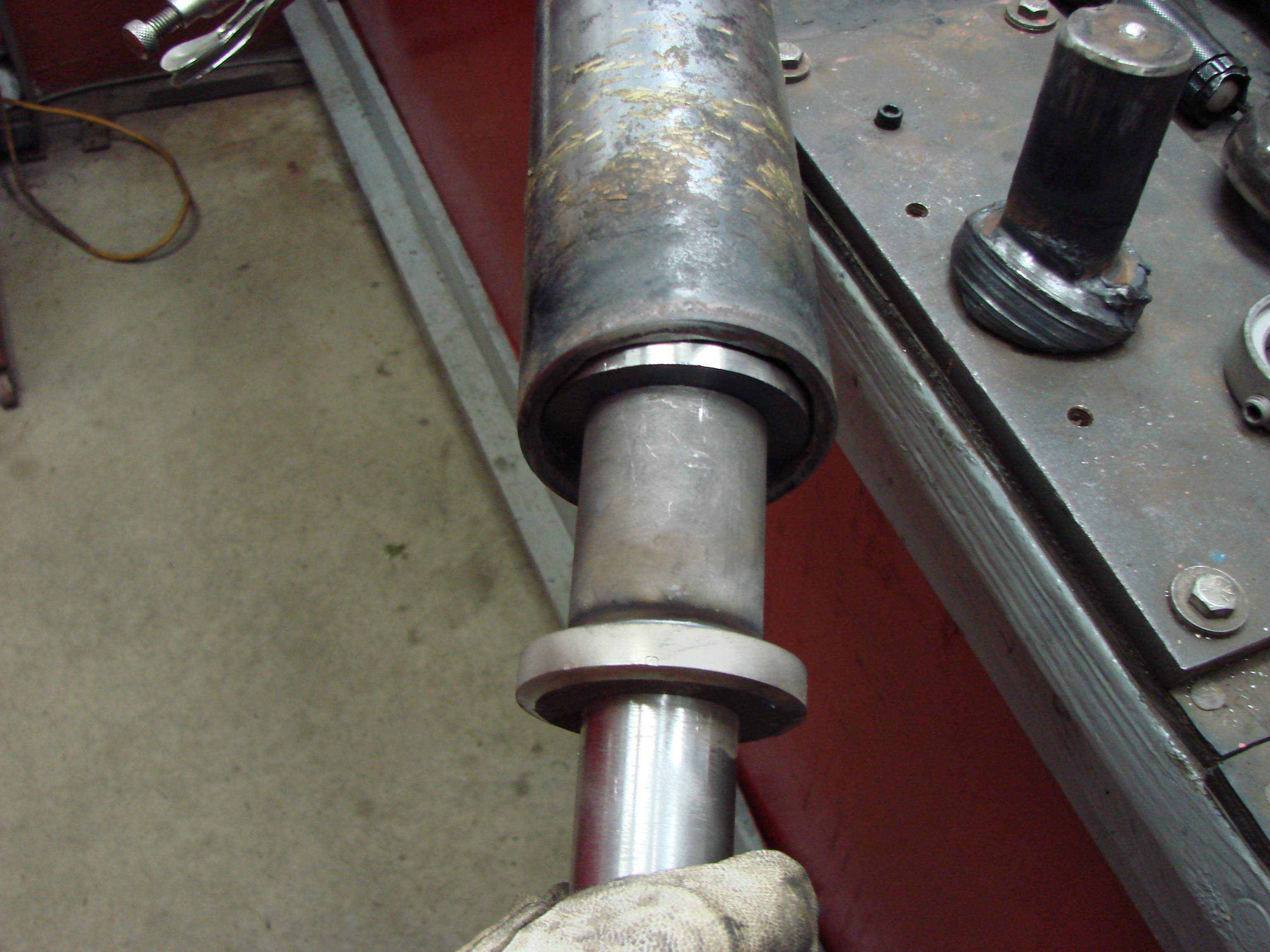 I made the new shaft on the lathe. Then I machined two large washers. The inside one was 1/4" thick and the outside one was 1/2 " thick. Once I had all the machining done I put the machined items in the welding postioner and used the Millermatic 350P:cool2: on pulse for most of the welding.