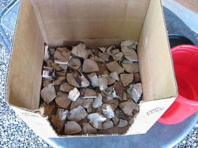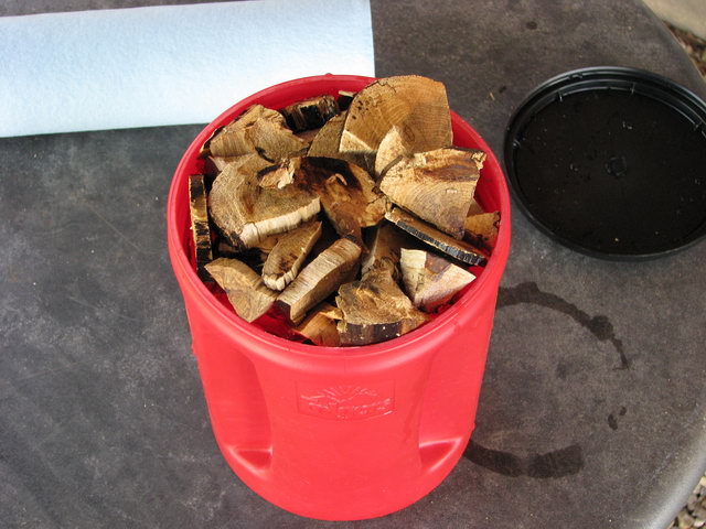Here are some pictures of the new smoker in action. I cut some pecan chips to use for the smoke and soaked them in water. It only took a double handful of chips to do all the smoking. As you can see in one of the pictures, there was plenty of smoke coming out the vent.