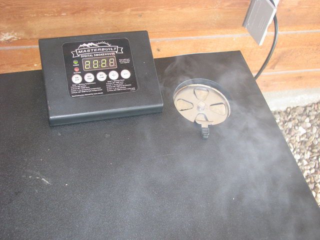When I started the smoker, it was 72 degrees inside. 50 minutes later, it was 225 degrees. The thermostat maintains the temperature within 5 degrees either side of the set point. Because the heater ran constantly during that first 50 minutes, there was a lot of smoke produced early on and then less as the meat cooked.