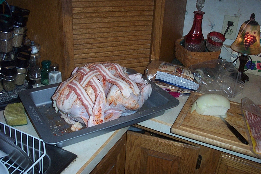 Yep, Scotty, you'll have to let us know how it turns out. I've never stuffed a turkey before cooking it, no matter how I cooked. We always make the "stuffing" separately. And I've not tried the bacon on a turkey, so it ought to be an interesting experiment.