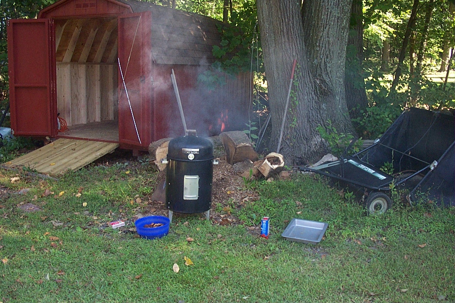 I started at 9 am with the smoker in the shade and the outside temp was only 50 degs, and my temp was coming up slowly but now the smoker is in the sun and its just perfect on the temp scale. That tells me that if I want to do much of this in the winter I either need more hot coals or a nice unit like you have ! :) Either way we are havin some fun today, its a perfect weather day here and the beer should be flowin very soon ! ;)