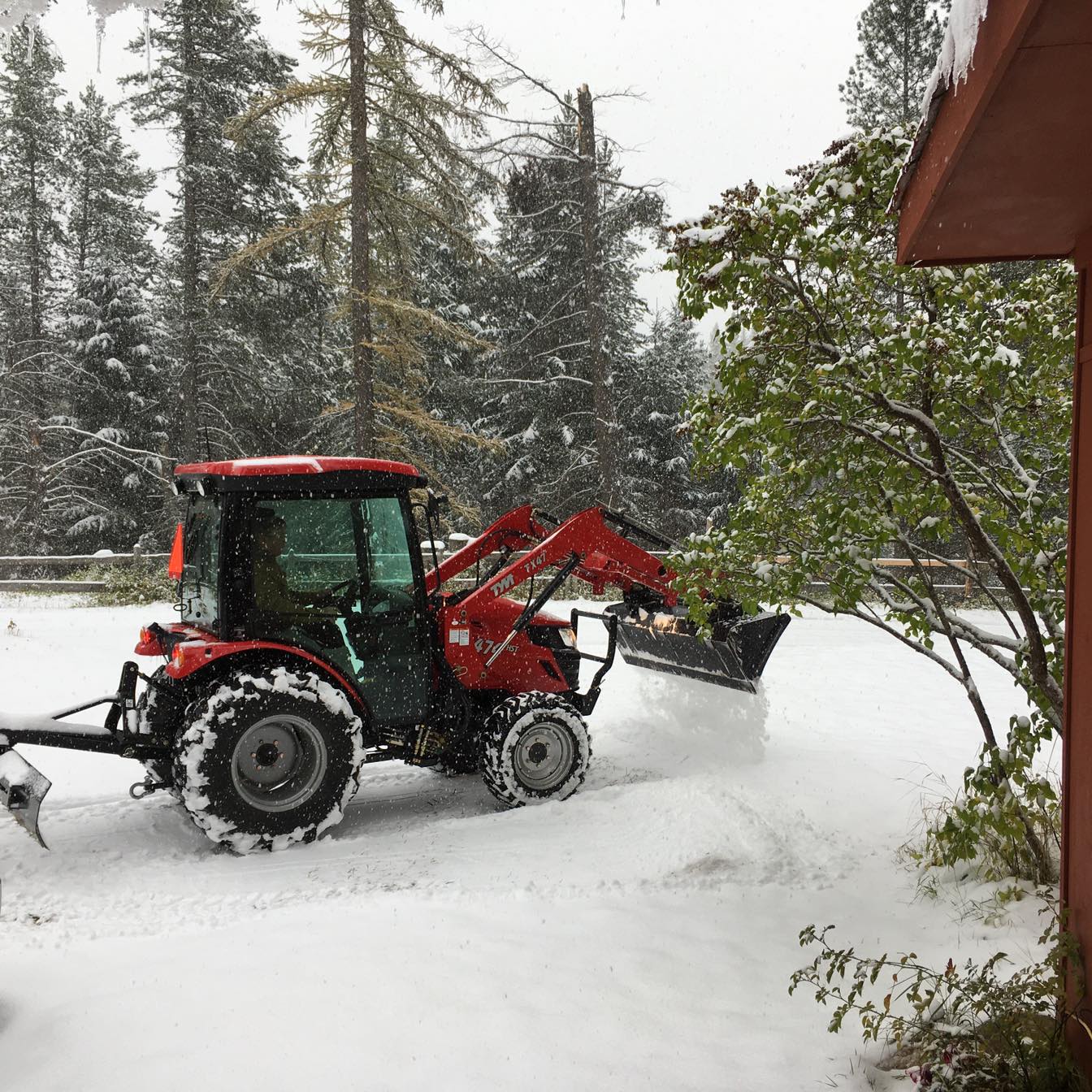First snow of the season in NW Montana. Gotta use front bucket/rear blade carefully until ground is frozen, THEN the MK Martin inverted blower will be the weapon of choice.