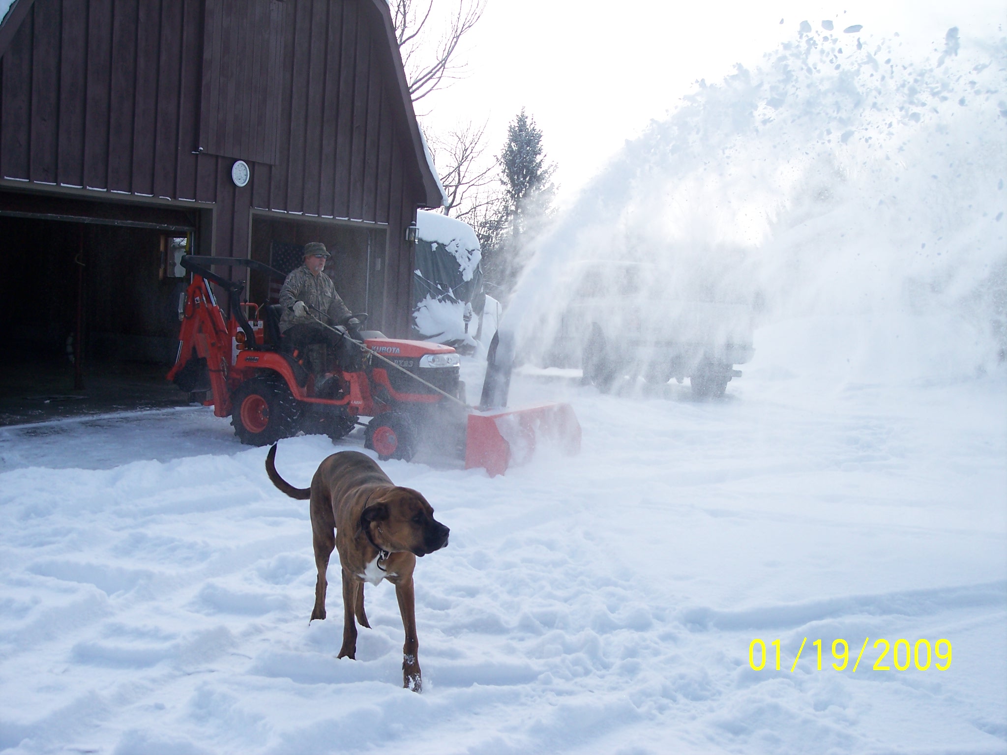 - Leaves the FEL on: Usually I don't get out to clear the driveway until after work, after the plows have pushed a large pile across the end of the driveway. Often, that pile is packed hard, had salt in it and turns to about 1/3 ice by the time I get there. Blowers don't do a very good job of cutting through that stuff. With the rear blower, I can blow out to the road, turn around and dig out the end drift/pile, then carry on with the blowing. I can also use the FEL to scrape concrete, back drag snow from up against garage doors, etc... Basically gives me a mult-tool for snow removal.