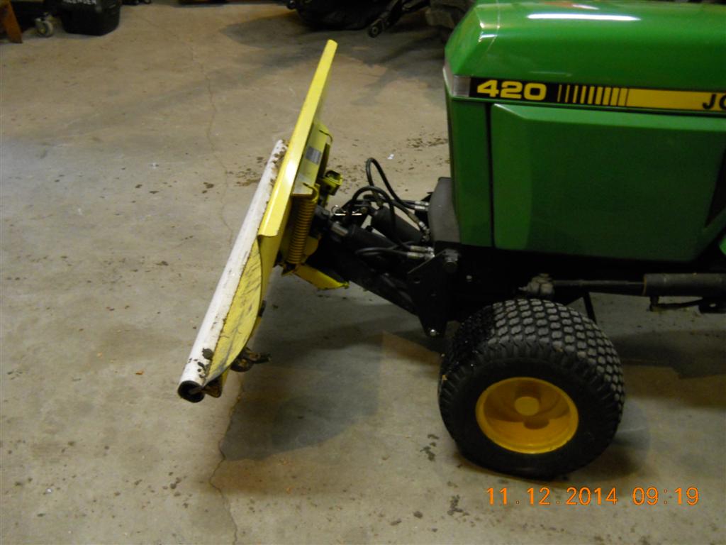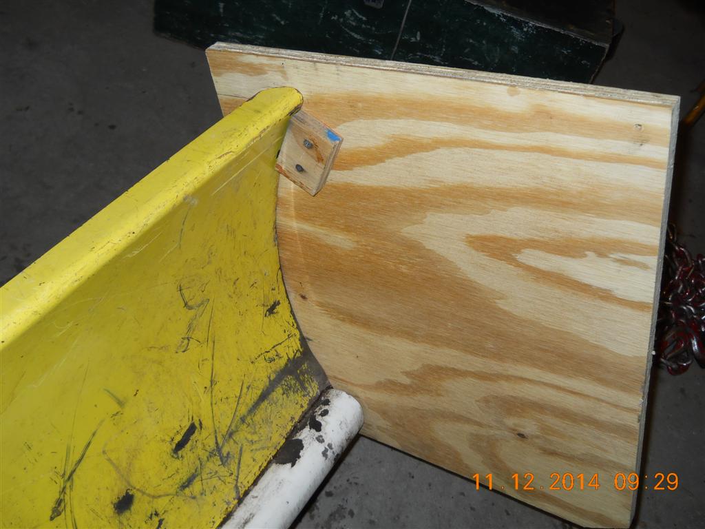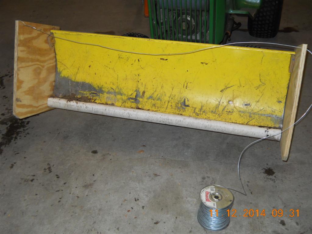 I normally run a snowblower, but here is my snow pusher I use for lesser snows... like the 6" of lake effect we received this morning. Just adding wings to my 54" front blade on an about one thousand pound JD 420 garden tractor. Two range HST, Onan 20hp. Just put two 100 pound Allis Chambers weights on the rear this year, usually put four... and she will push straight ahead until the engine stalls.... unless heavy ice. Used to use just one plastic pipe on the bottom edge, but now I am adding a second PVC pipe over the first. Having a harder time finding the black plastic pipe. The inner pipe seems to keep the outer one from cracking as easily. This setup I am putting on this year is new, with one of the older 'wings' shown in one of the pictures. When I got it assembled, I put a fresh Tractor Supply electric fence wire on the top to keep it from spreading. The bottom rod [ 1/2" stainless bolt lengthened in the middle by adding some 1/2" rod ] goes thru the angle brace behind the blade, and the top rod is a piece of 1/2" galvanized pipe. The rods hold the 3/4" plywood wings in place snugly on the end of the blade. I put two small woods blocks on the front of the blade to hold the wings in place on top. And the added wire keeps the wings from trying to spread too far apart. Anywhilst, this is how I have been doing it for years.... :)