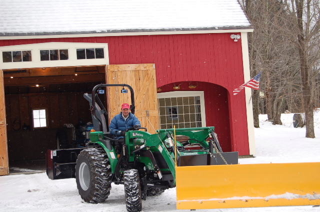 Hello everyone from Snow covered Vermont. I've been reading this site for a year but have never contributed til now. After researching how others have adapted truck plows to tractors, I finally finished my project to mount a 7.5 ft. Meyers plow onto my Montana R4344. Here are a few pics of the finished product (before it started snowing heavily). Blade angle is accomplished by simply using the existing rear hydraulic valves and running the 3/8 in. lines to the plow. I installed 2 in line flow control valves which help slow down the speed of the power angle. So far the rig works great. The only thing I might add are tire chains since I push uphill on a long driveway. The blade pitch, blade angle, and loader frame height take a little practice to allow the plow to float properly but I now feel I have acquired the right "touch" and feels automatic. The plow shoes have now been removed since the ground is frozen and that allows me to scrape a little cleaner.